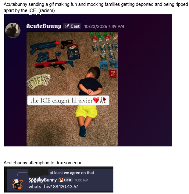 - Acutebunny sent a GIF mocking families being deported and ripped apart by ICE (racism). See the composite proof in the 764 section above (same image includes this context).