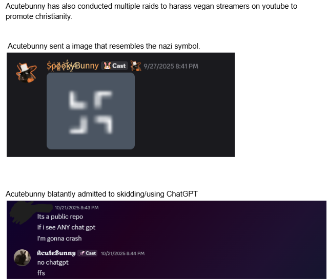 - Acutebunny has openly admitted to skidding and using ChatGPT.